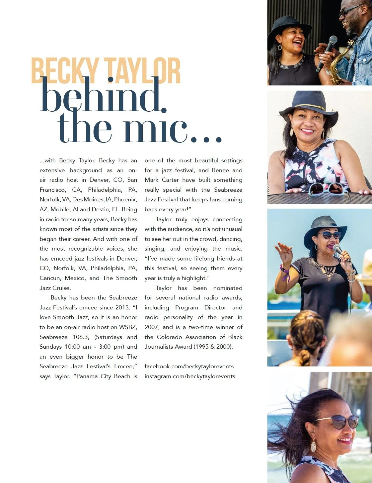 Becky Taylor serves as an emcee for various events, from jazz festivals to corporate gatherings, ensuring each occasion runs smoothly with her energetic and engaging presence.